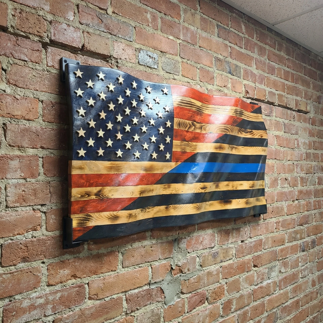 Custom wooden flags are built one at a time, designed around your department, badge, unit, or idea. The flags shown below are examples of past custom builds—each handcrafted with depth, movement, and the signature wavy‑wood style. No two are ever the same.